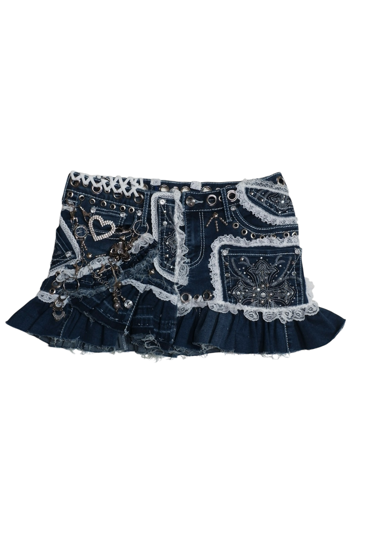 up-cycled denim mini skirt pierced w/ silver grommets, adorned with vintage lace trim + white cord  ꒰ᐢ. .ᐢ꒱₊˚⊹˖ ࣪⭑ features detachable silver charms + bedazzled patchwork details  ✧˖°.