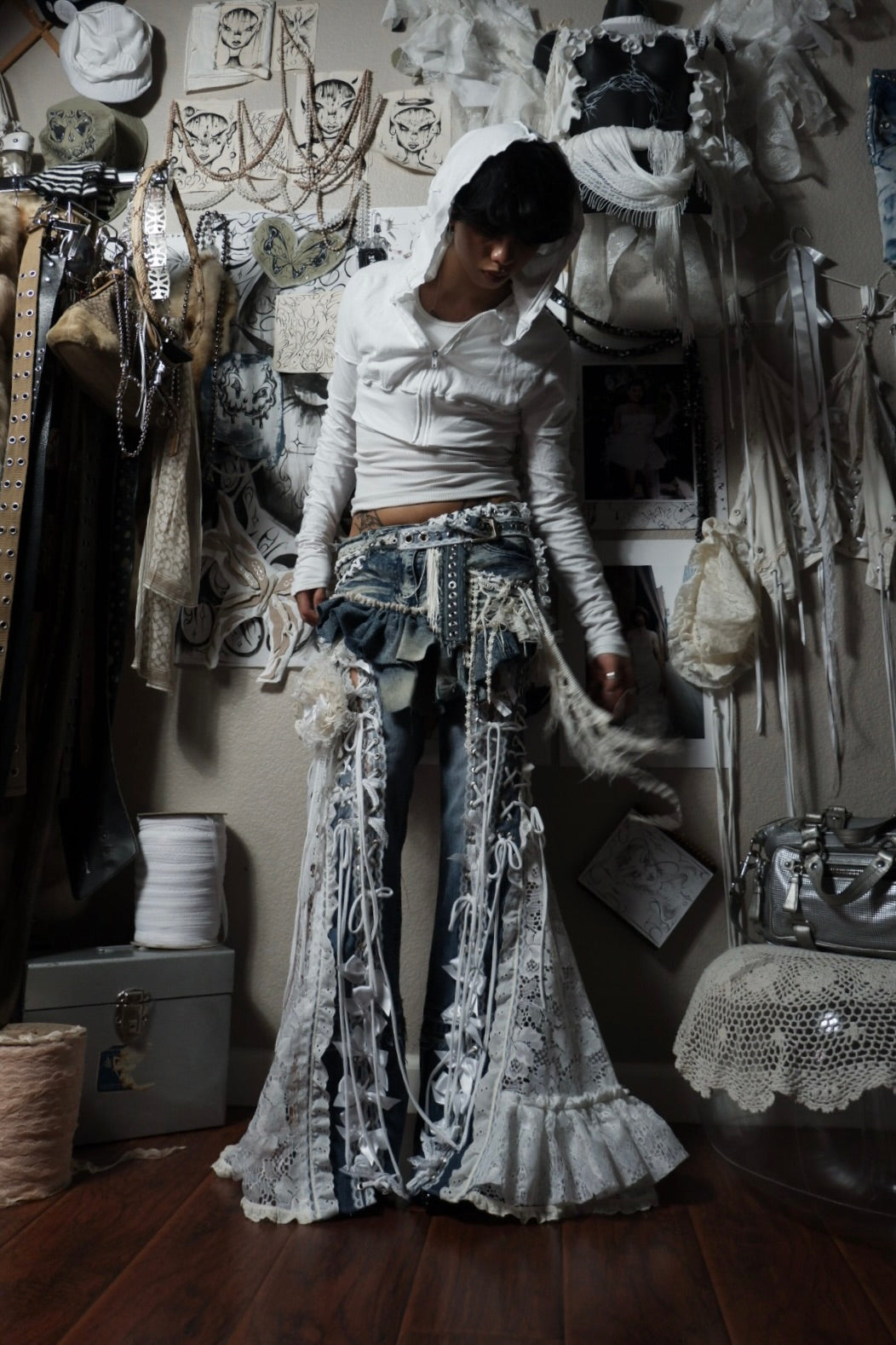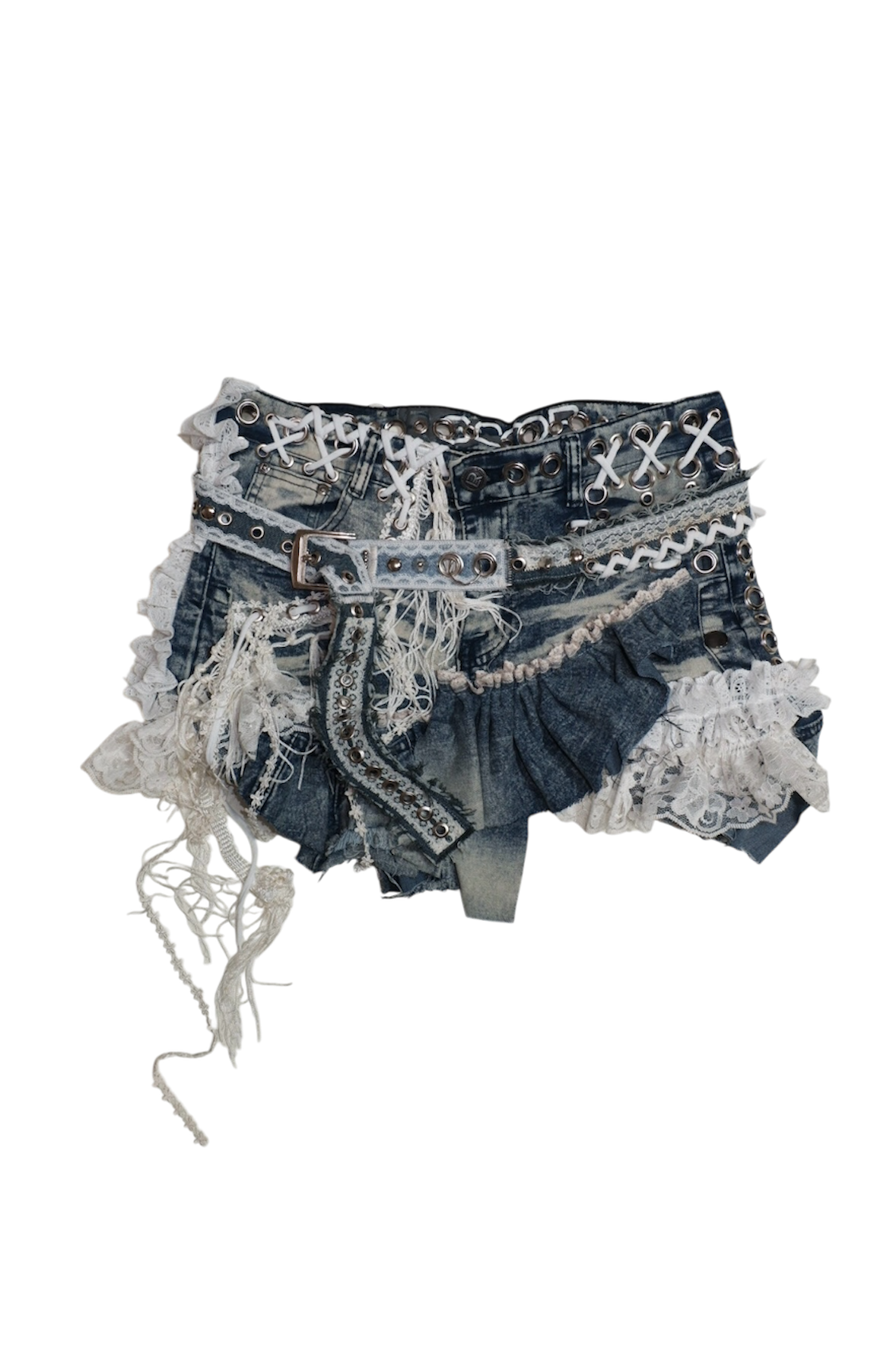 up-cycled denim mini skirt pierced w/ silver grommets, adorned with vintage lace trim + white cord ꒰ᐢ. .ᐢ꒱₊˚⊹˖ ࣪⭑ includes denim clouwdez belt ✧˖°.