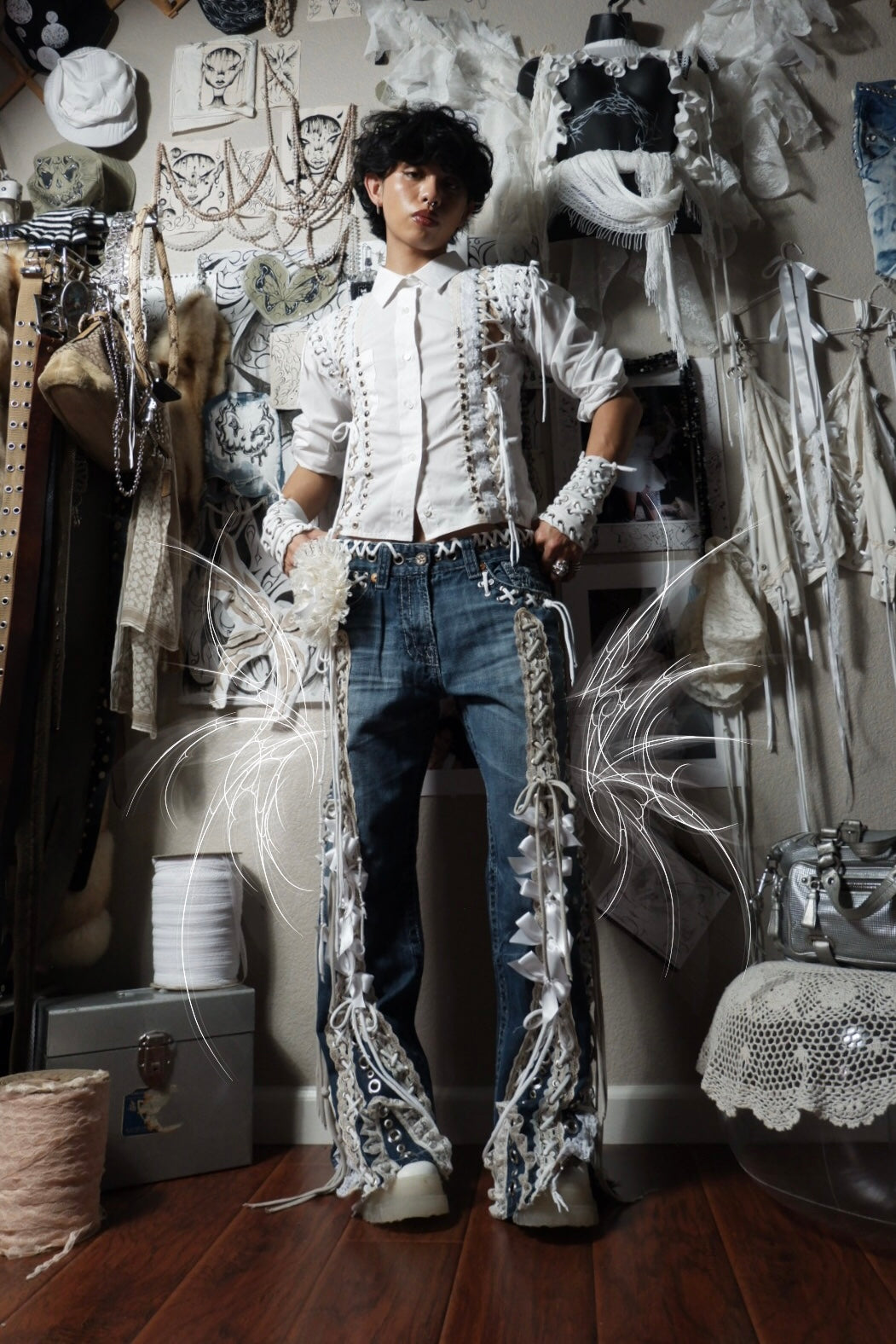 white hand warmers pierced w/ silver grommets and adorned with white cord ꒰ᐢ. .ᐢ꒱₊˚⊹˖ ࣪⭑ ✧˖°.
