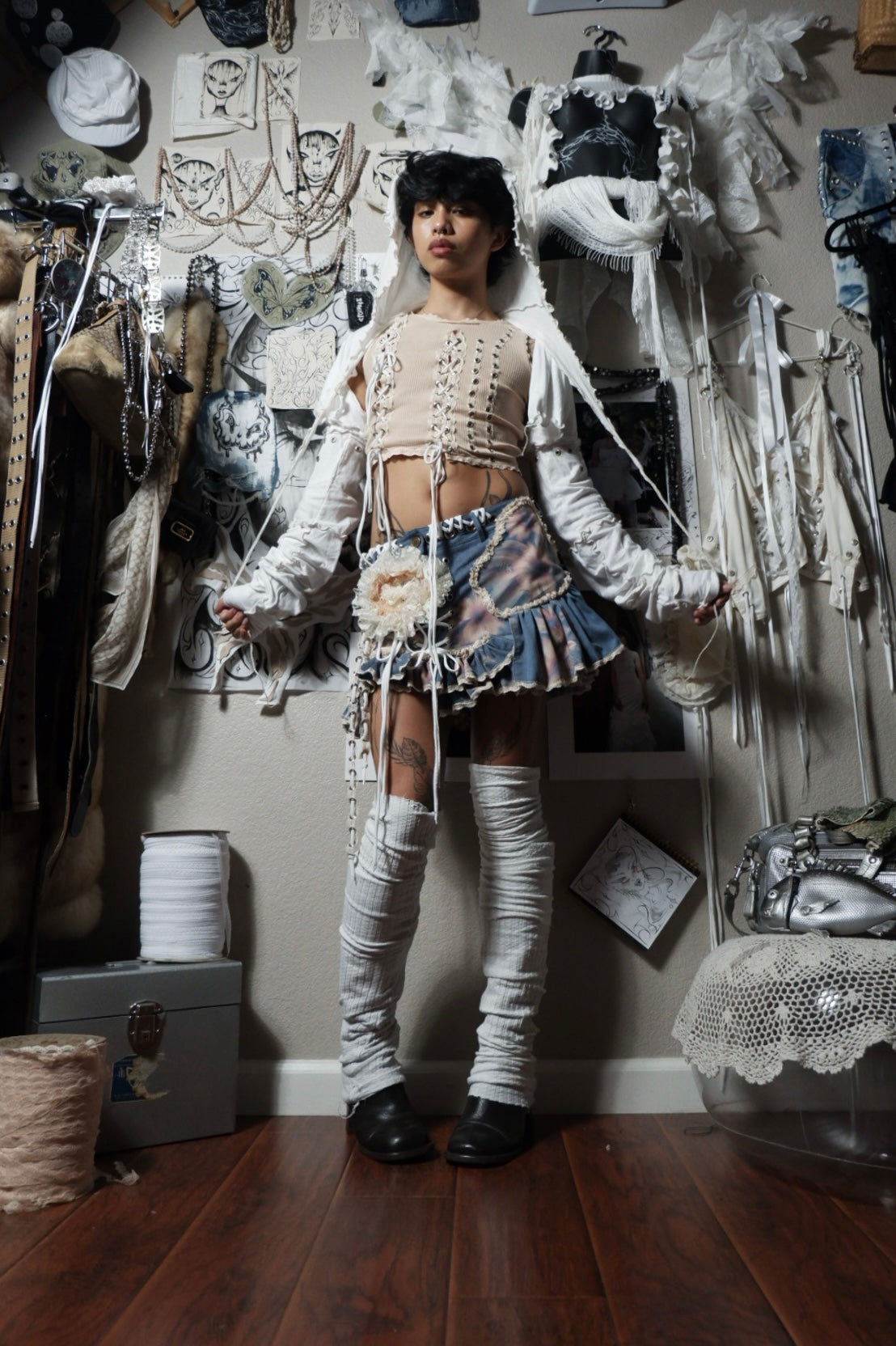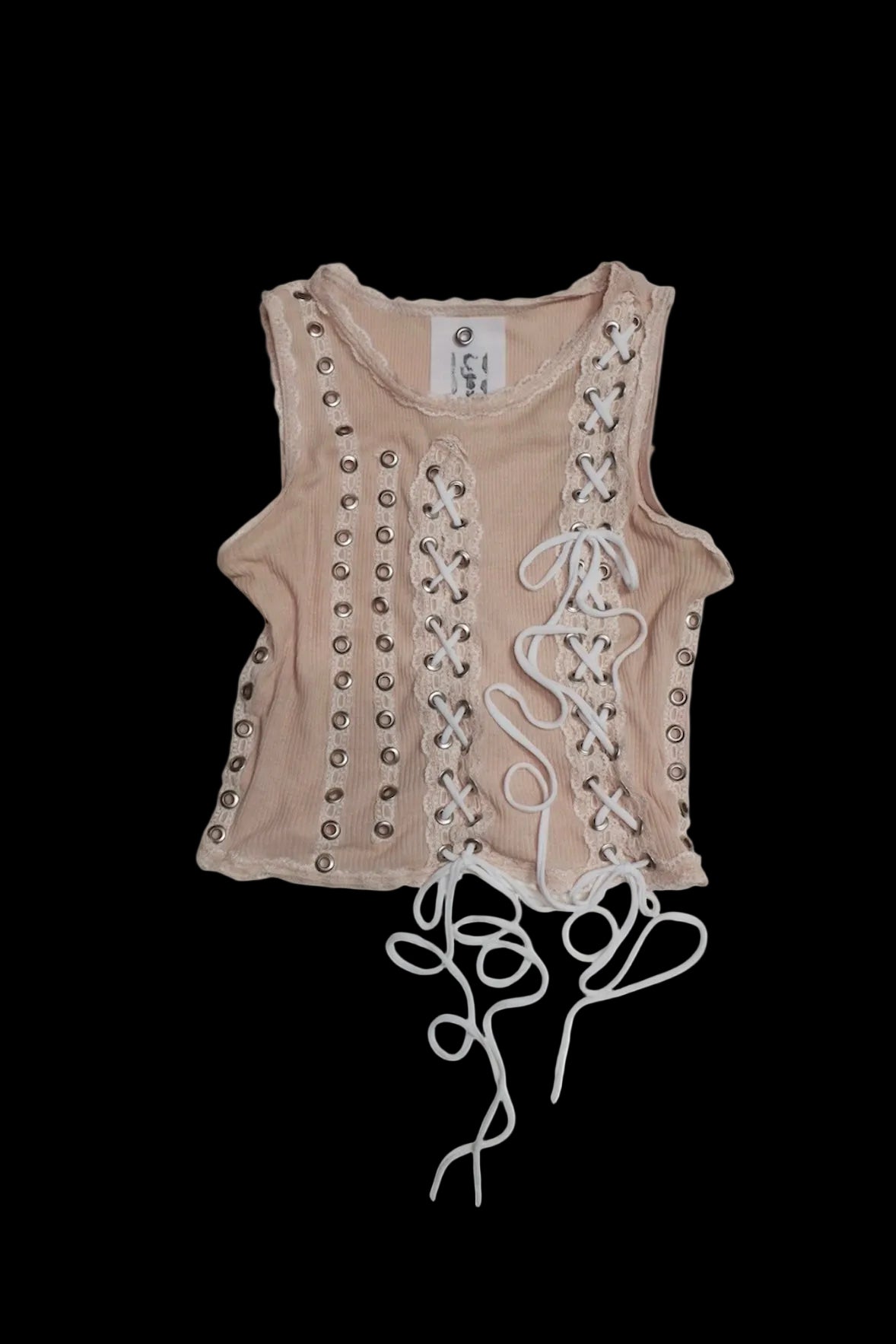 up-cycled pink tank top pierced w/ silver grommets, vintage lace trim, + white cord  ꒰ᐢ. .ᐢ꒱₊˚⊹˖ ࣪⭑