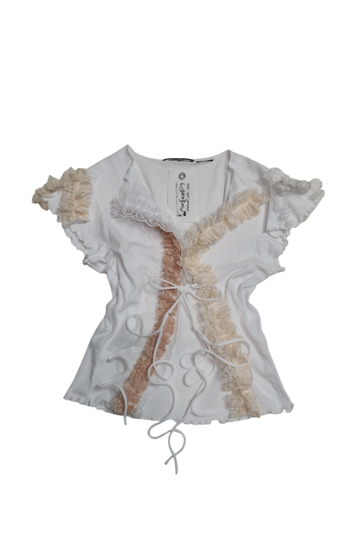 up-cycled white top adorned with assorted vintage lace trim + white cord closure ꒰ᐢ. .ᐢ꒱₊˚⊹˖ ࣪⭑