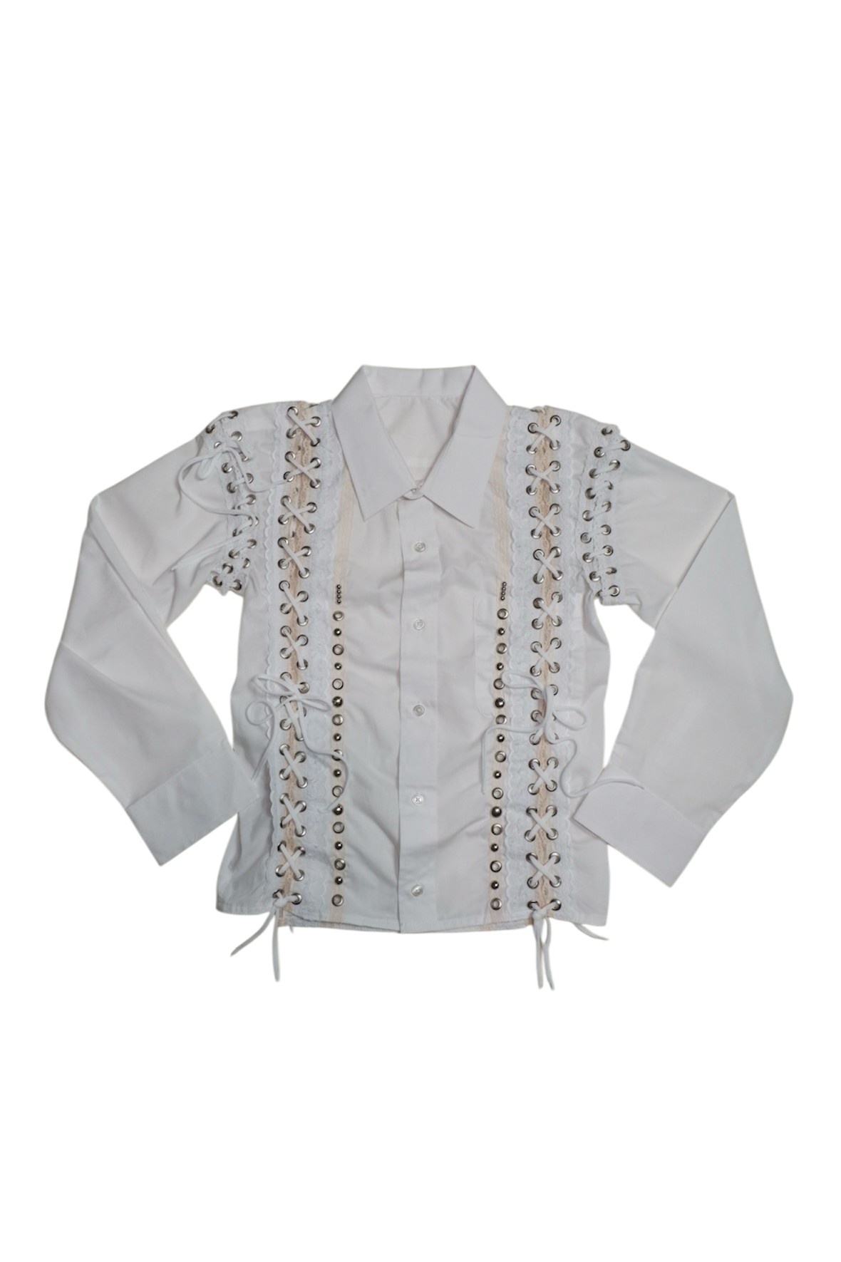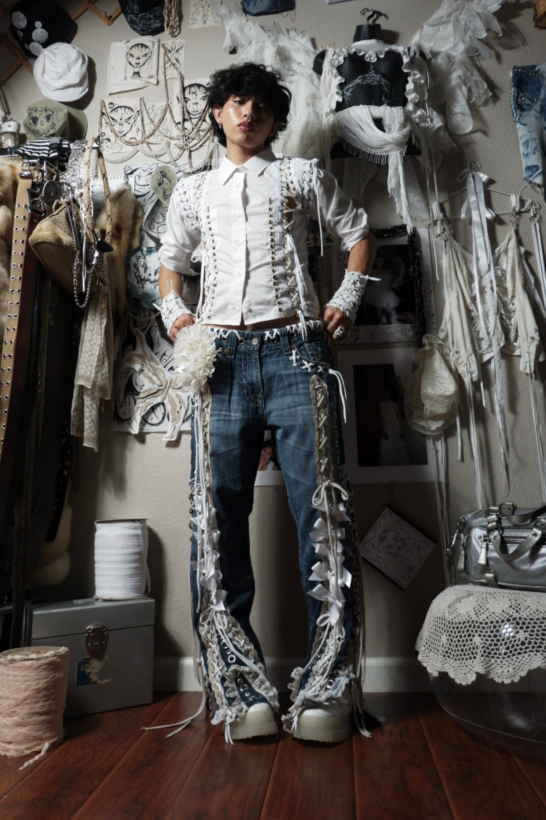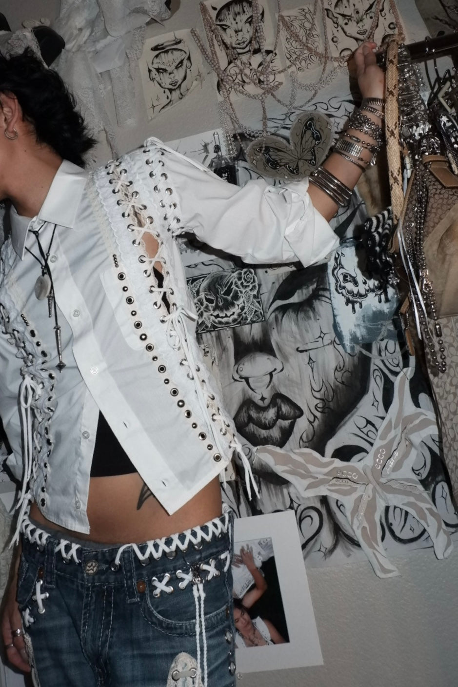 up-cycled white dress shirt top pierced w/ silver grommets, adorned with various rivets/studs, vintage lace trim + white cord ꒰ᐢ. .ᐢ꒱₊˚⊹˖ ࣪⭑