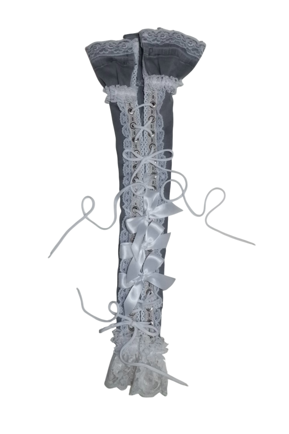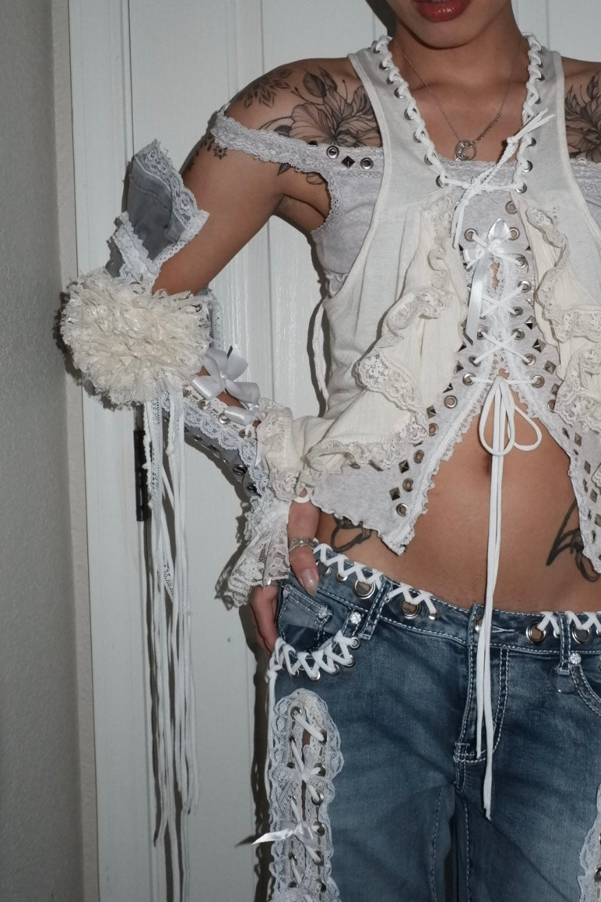 single, up-cycled grey arm sleeve pierced w/ silver grommets, adorned with various vintage lace trims, + white cord ꒰ᐢ. .ᐢ꒱₊˚⊹˖ ࣪⭑