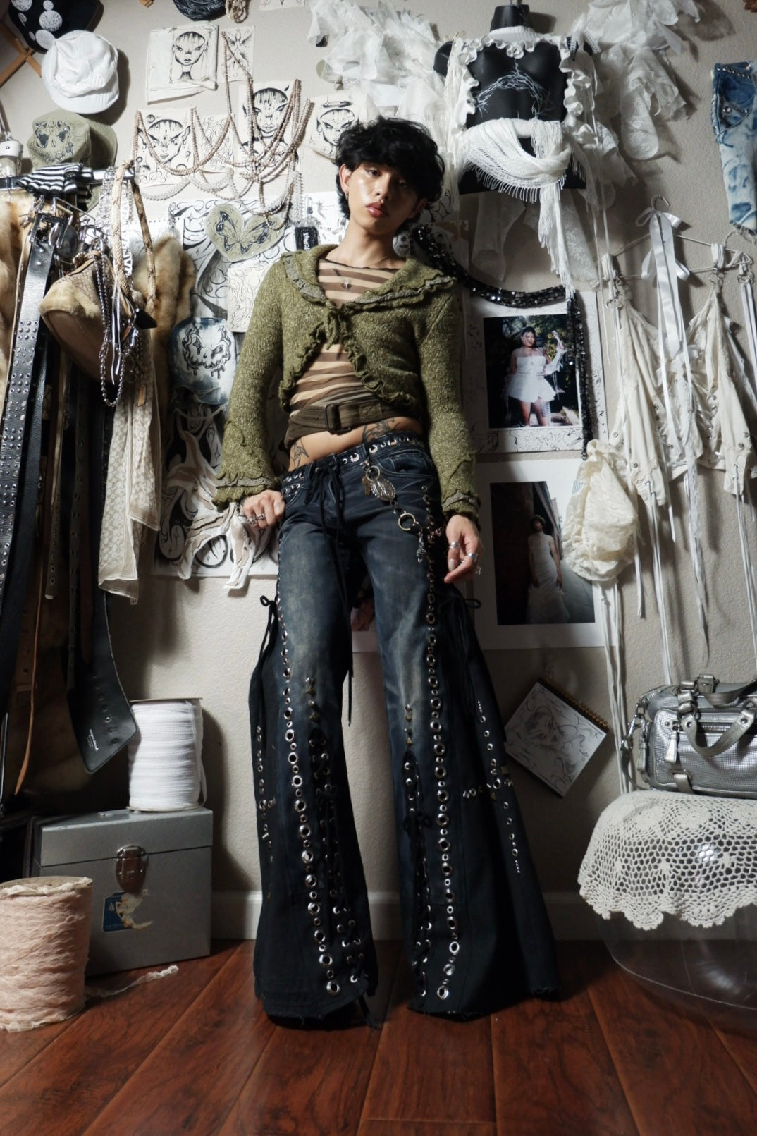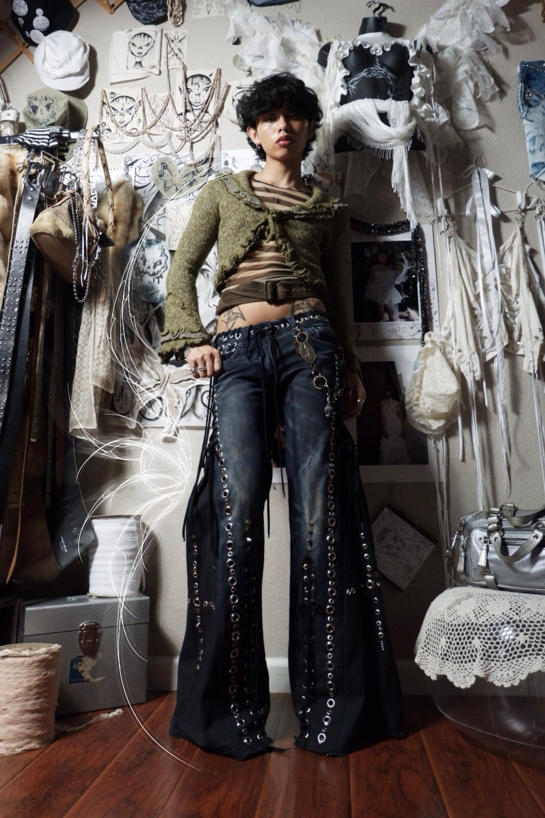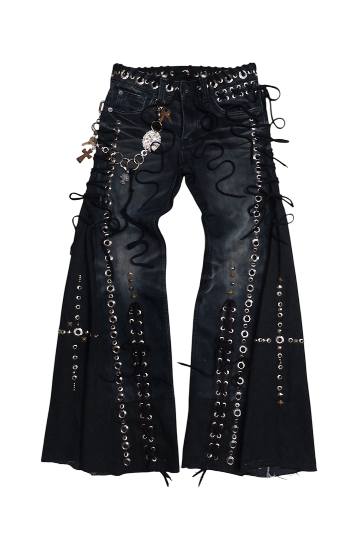 up-cycled denim jeans pierced w/ silver grommets + adorned w/ rivets, studs and black cord꒰ᐢ. .ᐢ꒱₊˚⊹˖ ࣪⭑ features detachable chain accessory ✧˖°.