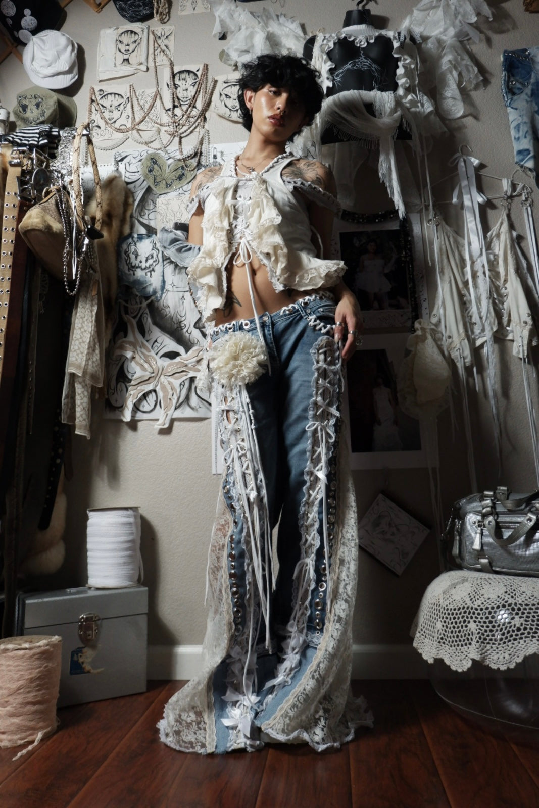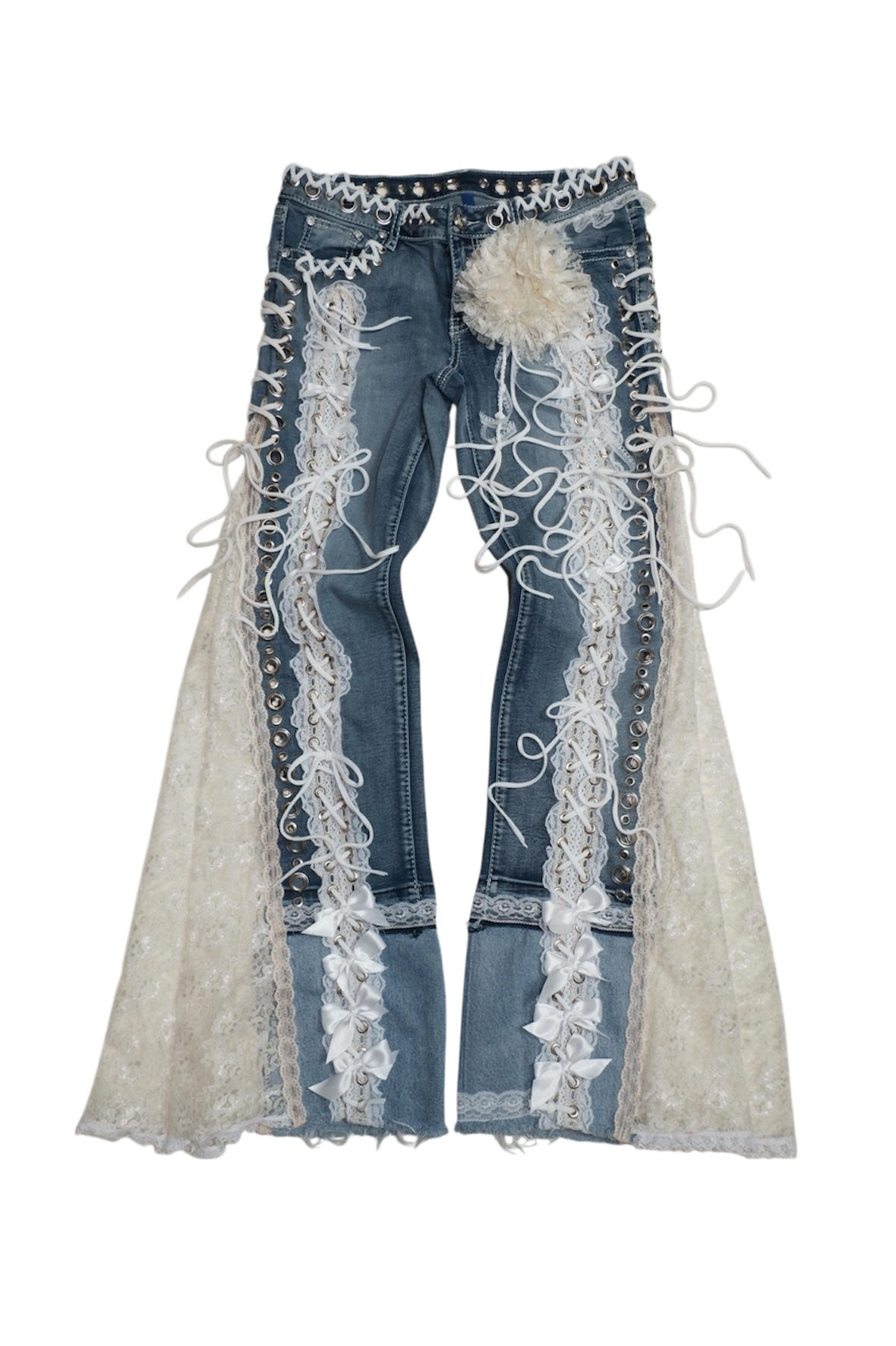 up-cycled denim jeans pierced w/ silver grommets + adorned w/ satin bows, lace trim, and white cord cord ꒰ᐢ. .ᐢ꒱₊˚⊹˖ ࣪⭑ features detachable lace flower detail + lace flare ✧˖°.