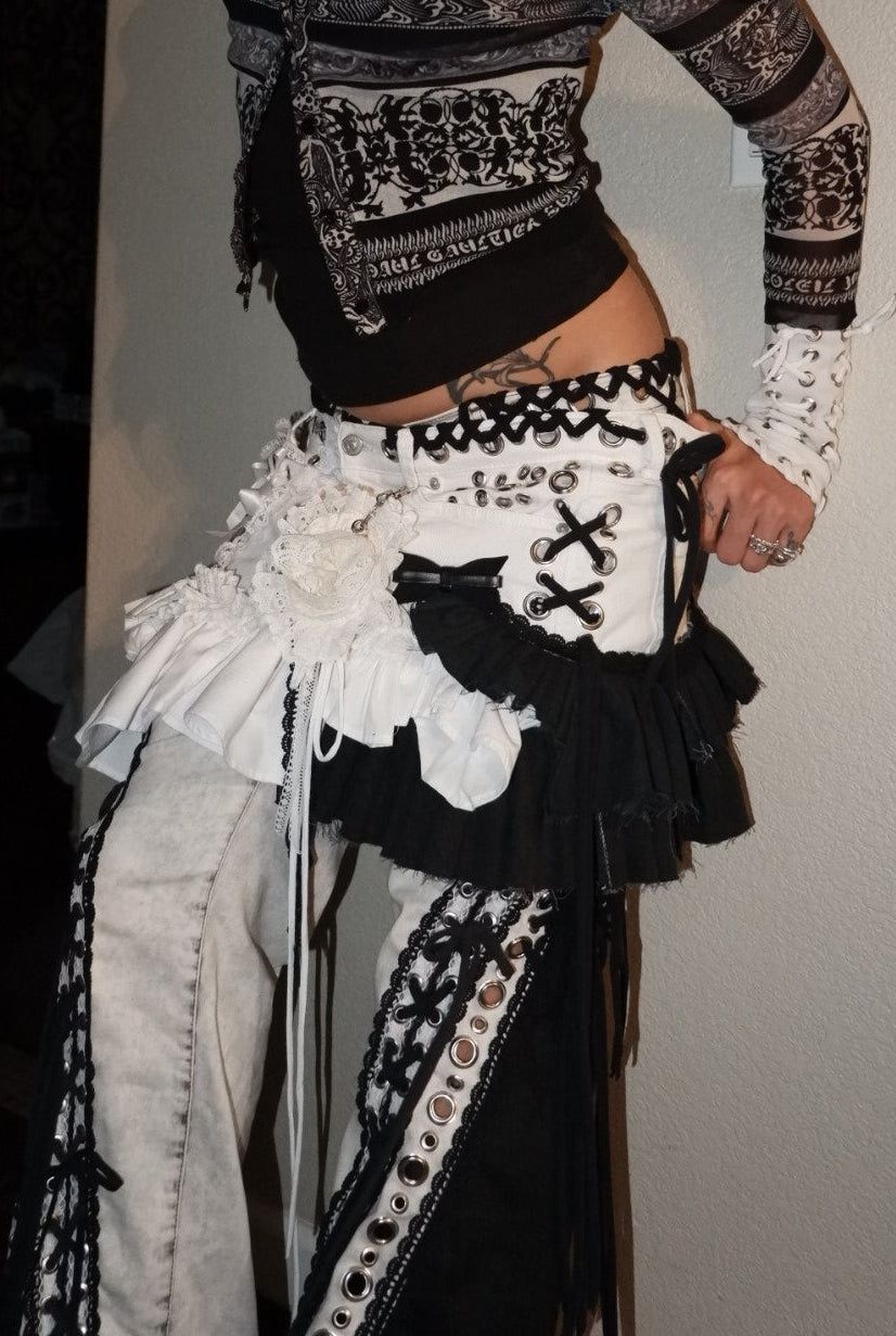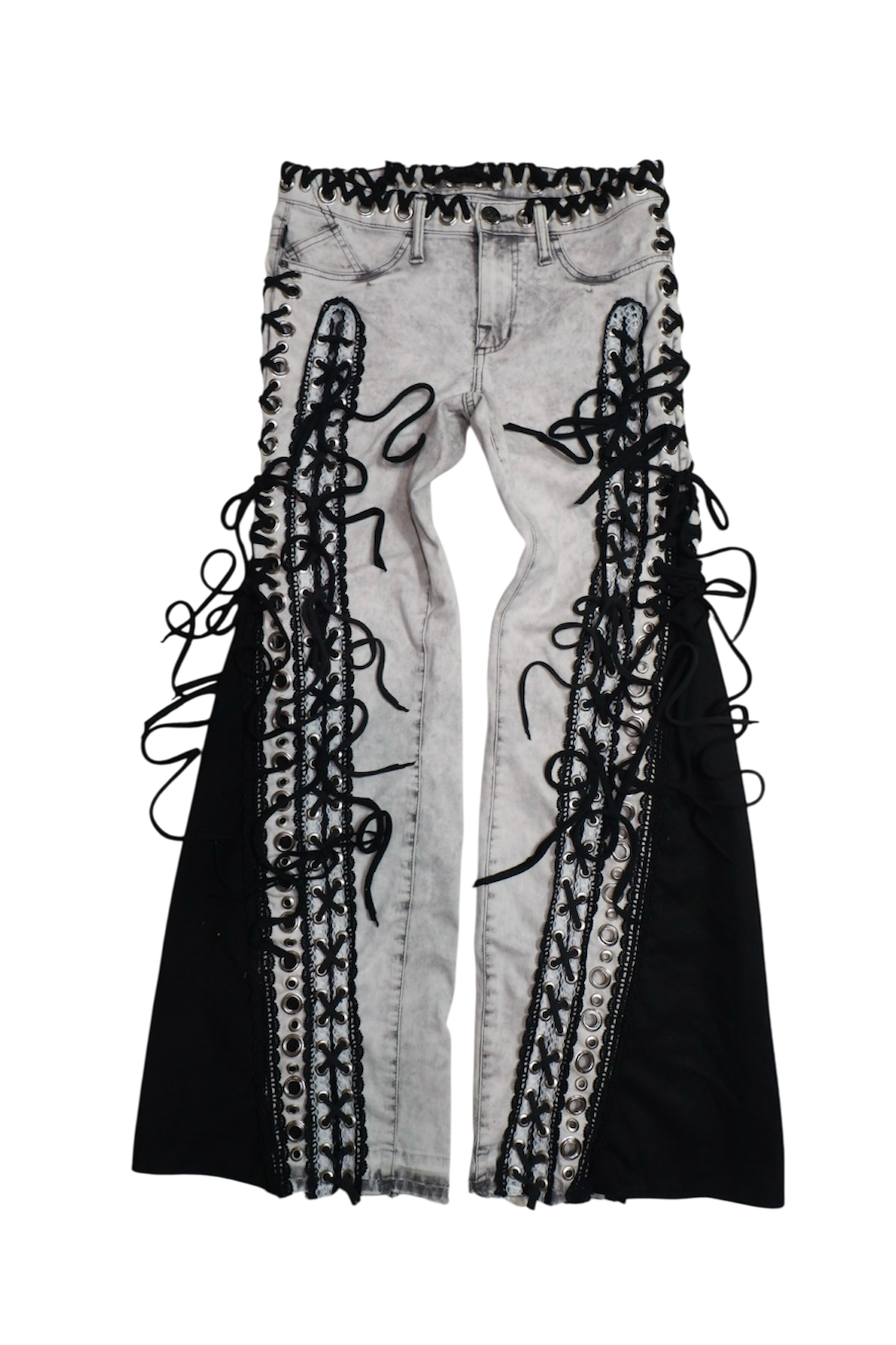 up-cycled white jeans pierced w/ silver grommets + adorned w/ satin bows, lace trim, and black cord cord ꒰ᐢ. .ᐢ꒱₊˚⊹˖ ࣪⭑✧˖°.