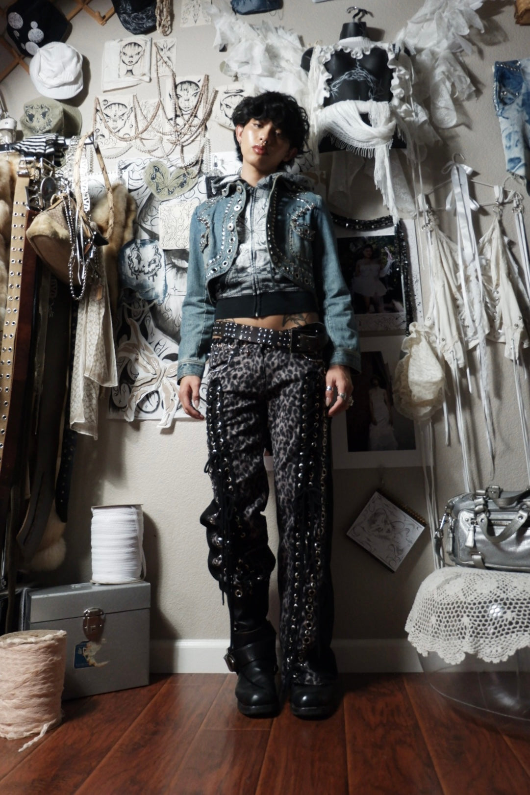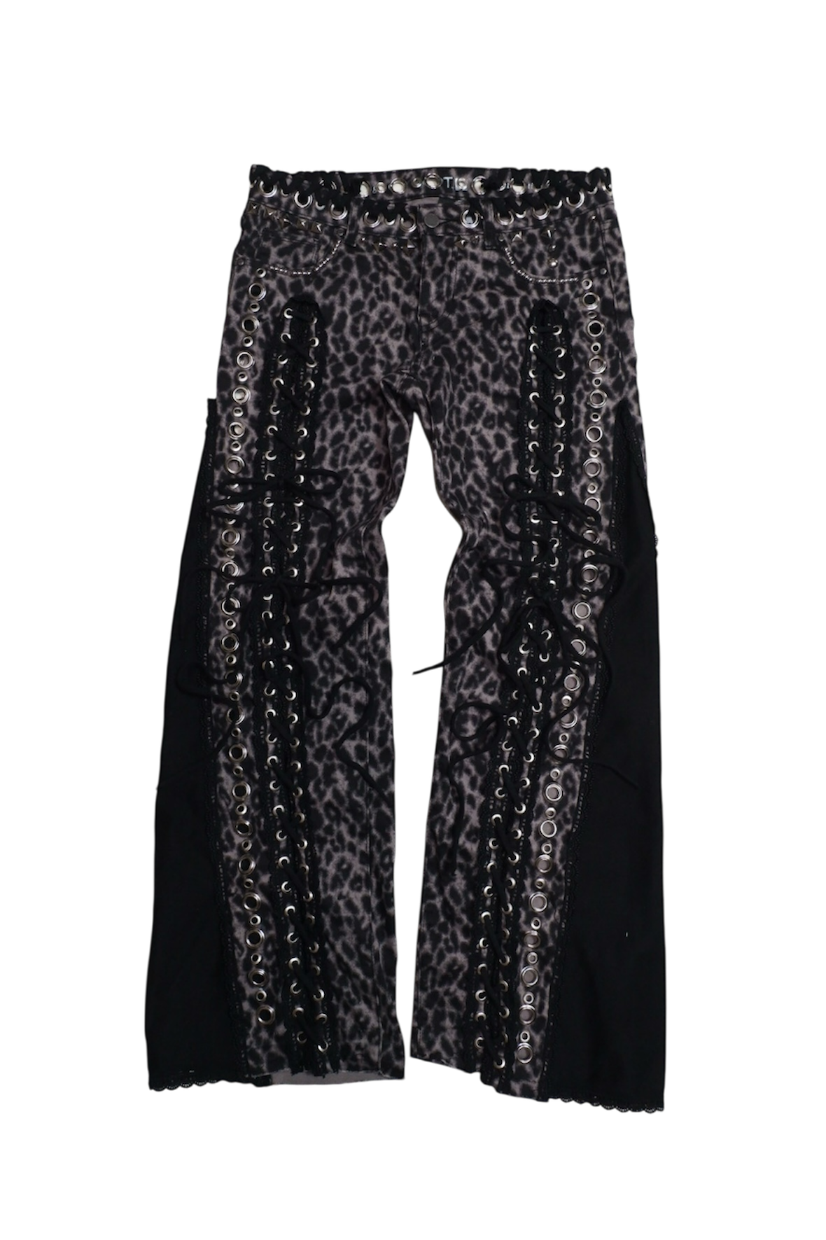 up-cycled cheetah print pants pierced w/ silver grommets + adorned w/ rivets, black lace trim, and black cord cord ꒰ᐢ. .ᐢ꒱₊˚⊹˖ ࣪⭑ ✧˖°.