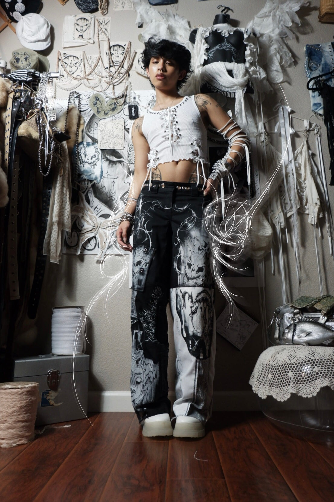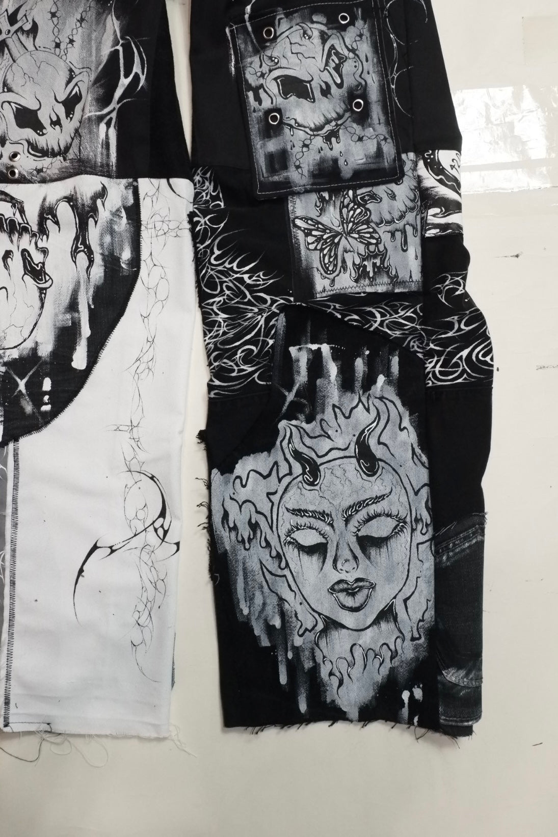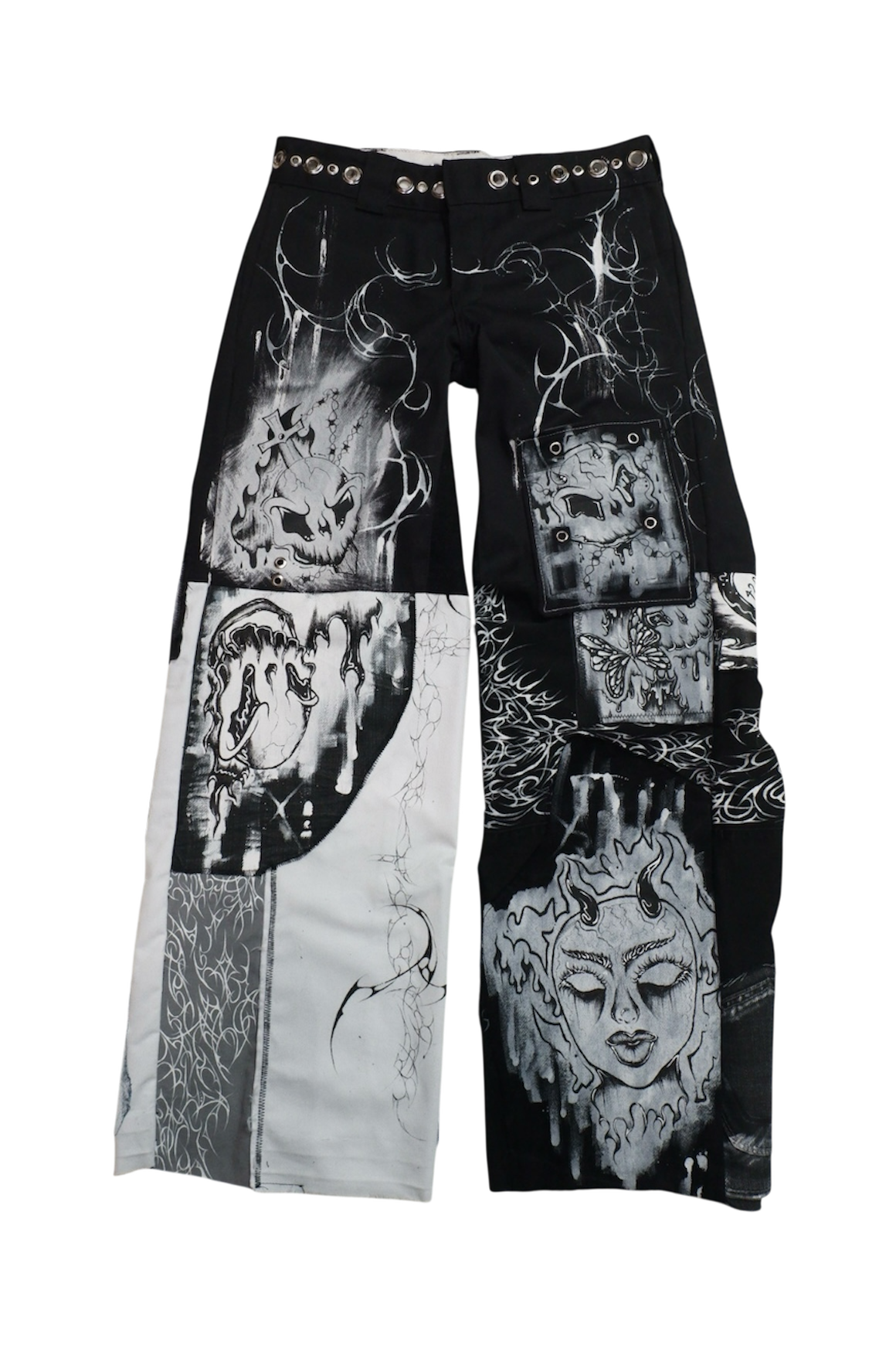 up-cycled jeans pierced w/ silver grommets ꒰ᐢ. .ᐢ꒱₊˚⊹˖ ࣪⭑ features various hand-painted patches, from archival clouwdez pieces ✧˖°.