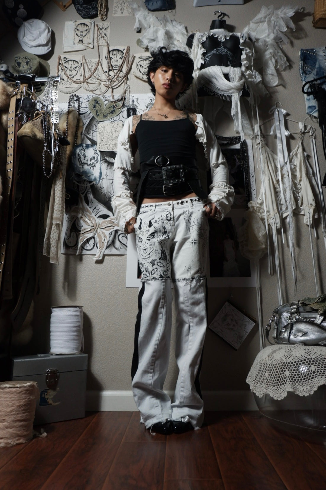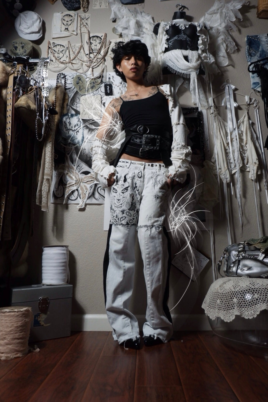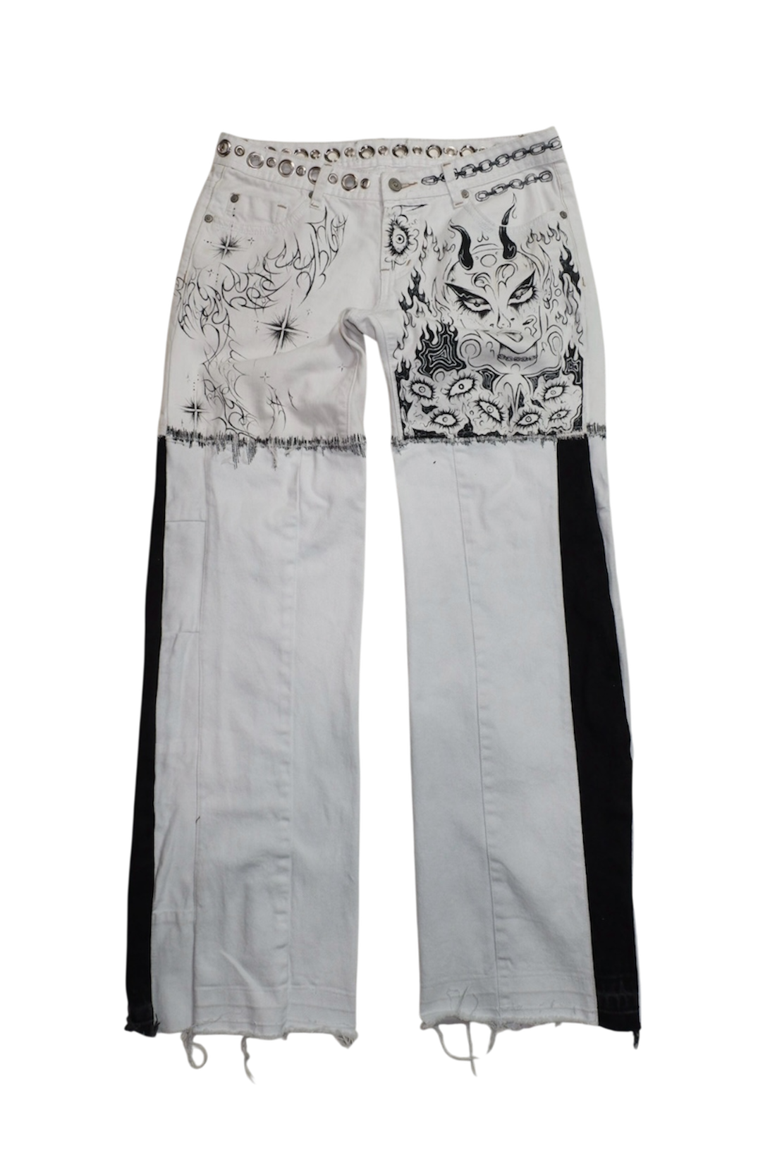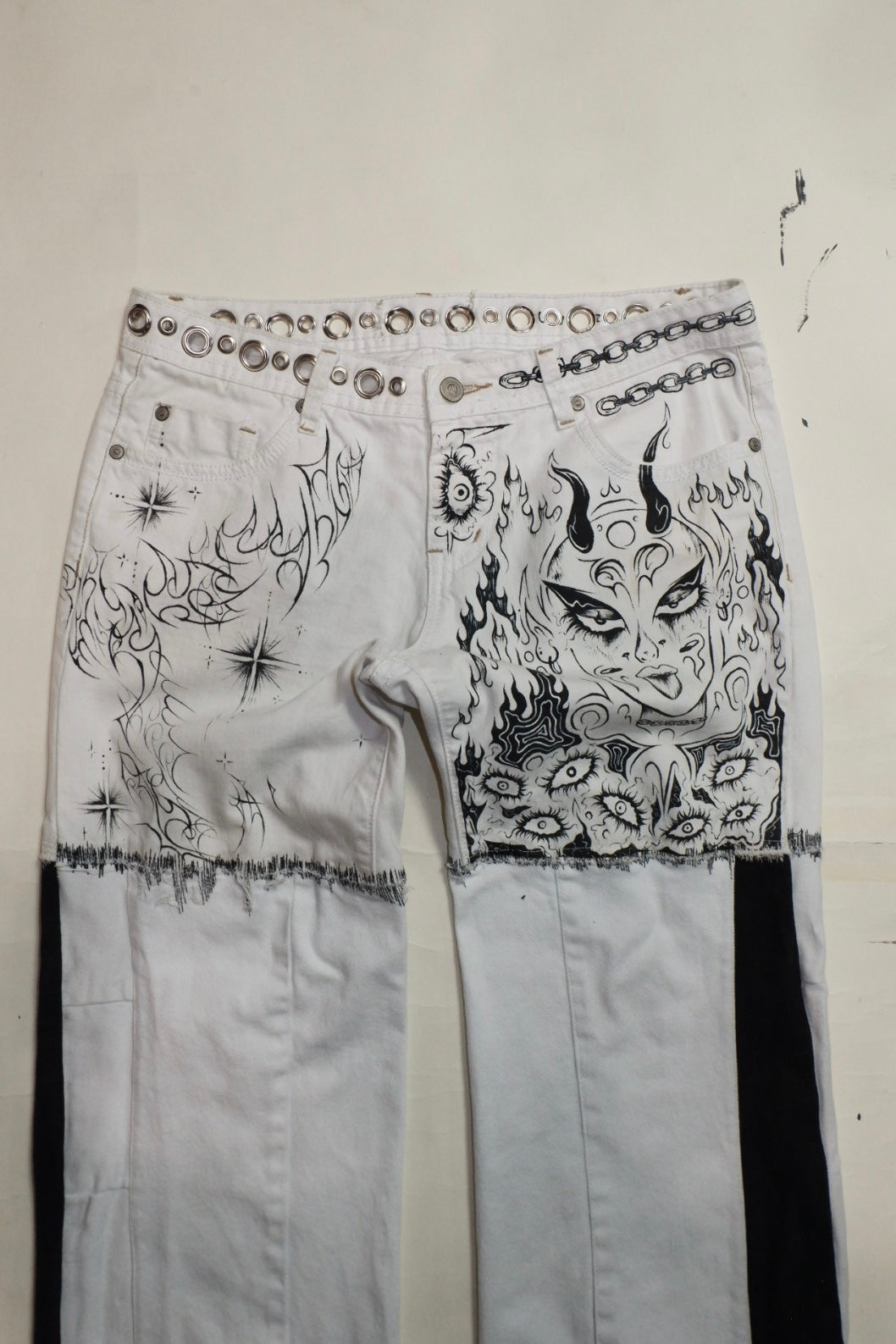 up-cycled jeans pierced w/ silver grommets ꒰ᐢ. .ᐢ꒱₊˚⊹˖ ࣪⭑ features hand-painted graphics ✧˖°.