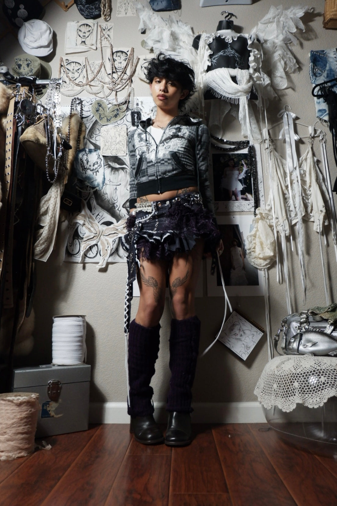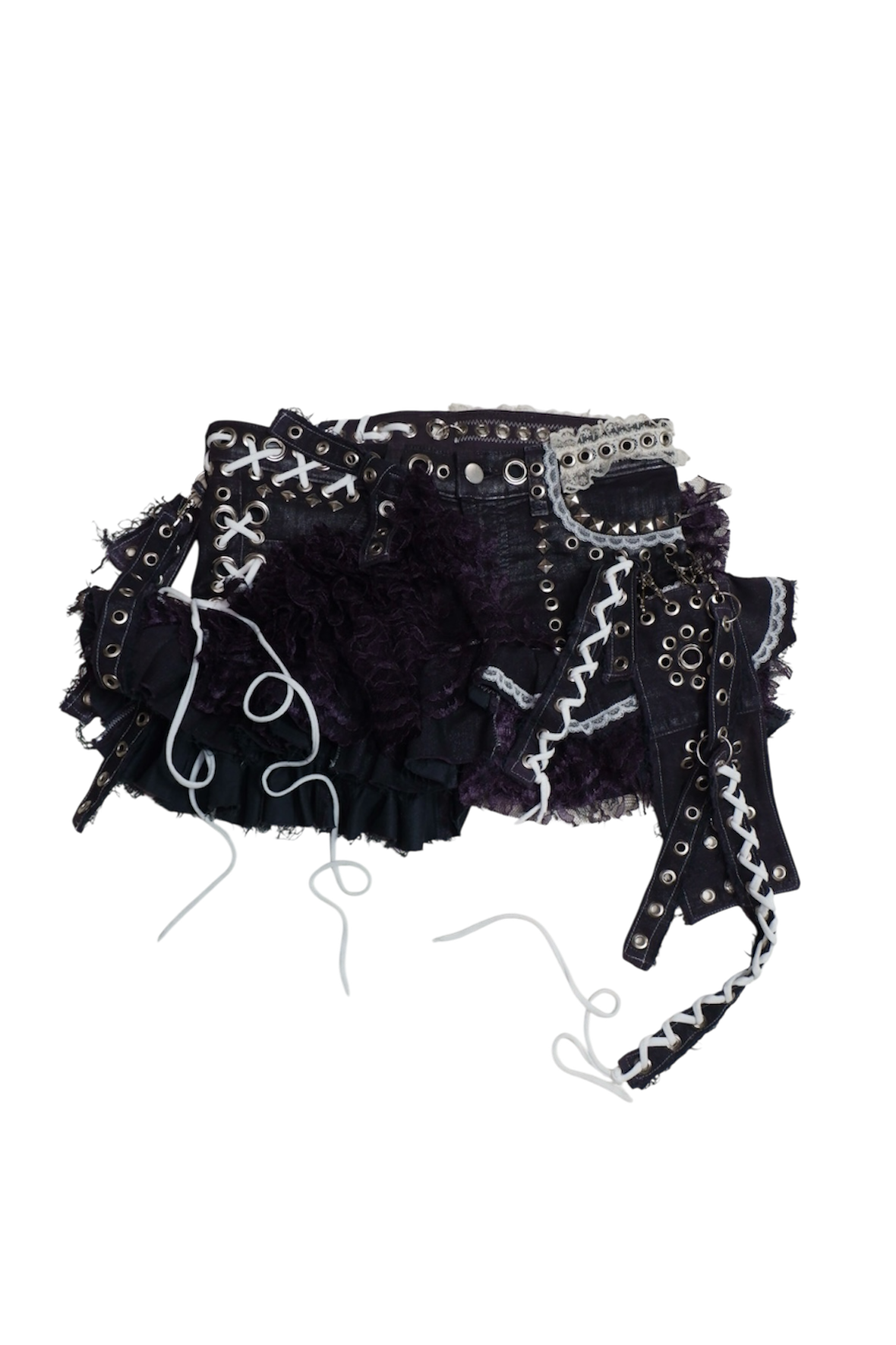up-cycled purple mini skirt pierced w/ silver grommets and adorned with vintage lace trim and white cord ꒰ᐢ. .ᐢ꒱₊˚⊹˖ ࣪⭑ features detachable grommet straps ✧˖°.